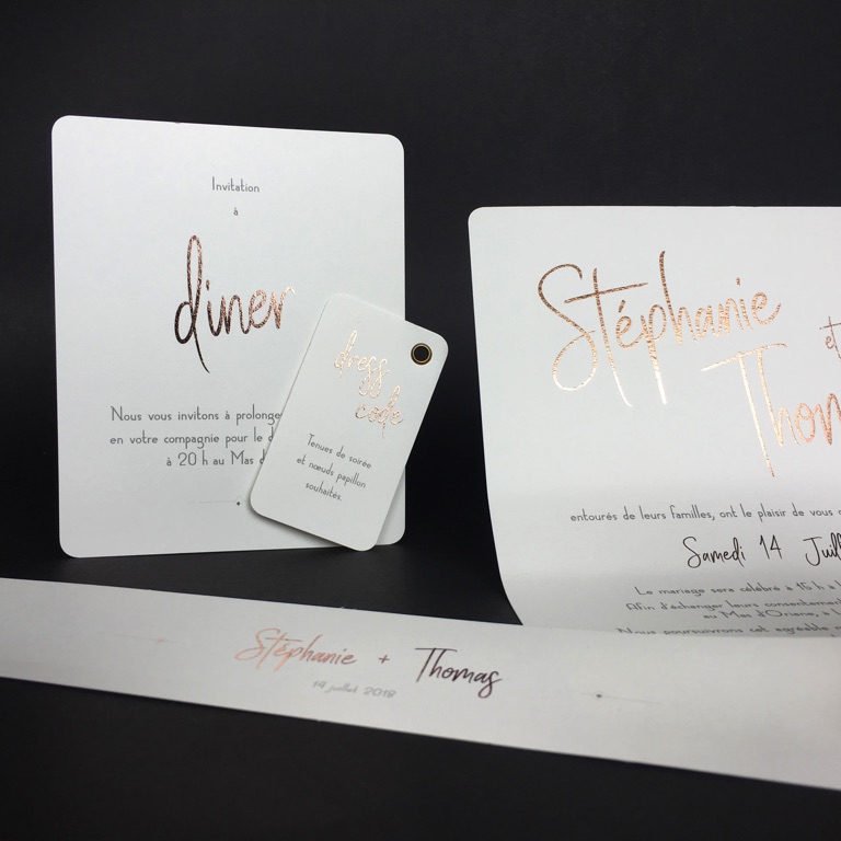 Faire-Part de Mariage dorure numérique Or Rosé – Olin Blanc Naturel – pose d’oeillets – découpe d’angles arrondisPierre BERTAU2018-05-23T21:50:33+01:00
