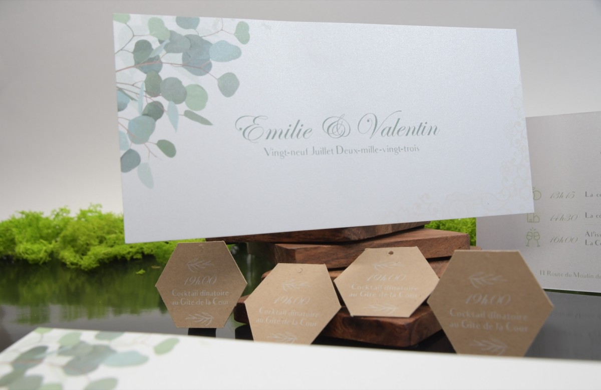 Faire-part de mariage feuille eucalyptus sur papier nacré – Sirio Pearl ice white – Coupon hexagonal en découpe laser sur kraft recyclé – cocoa shellPierre BERTAU2024-04-28T21:44:16+01:00