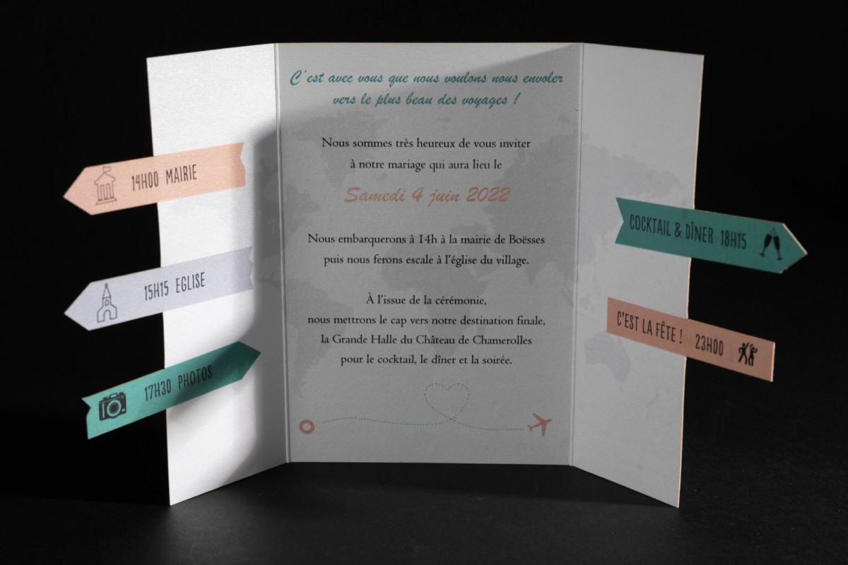 Faire-part de mariage panneaux direction – Papier nacré sirio pearl 230g – Découpe laser et rainages pli fenêtrePierre BERTAU2024-08-05T21:15:28+01:00