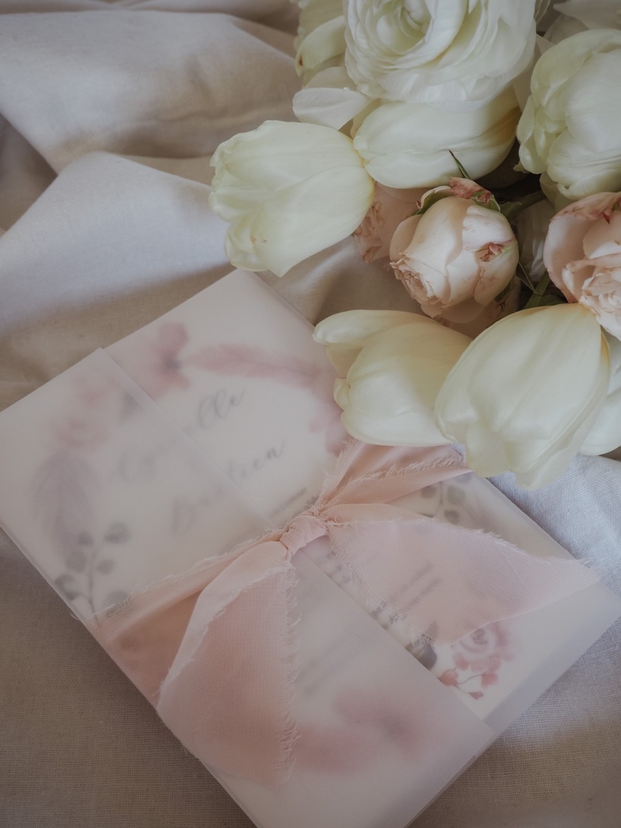 Faire-part fleuri avec pochette calque et ruban rose poudré – Calque 230gr en Pli fenêtre – Papier Arches Texturé 400gr/m2Pierre BERTAU2022-09-25T16:25:36+01:00
