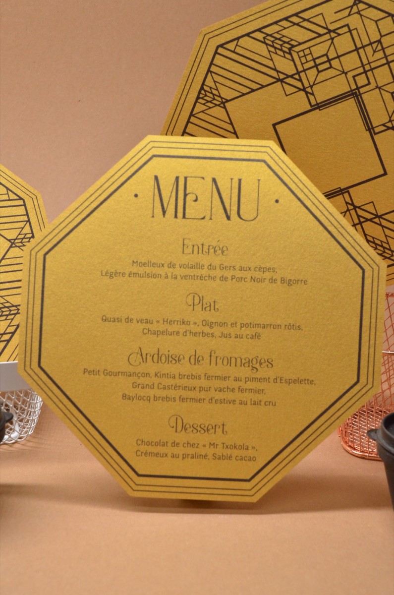 Menu réception Hexagonal – Thème Gatsby – Découpe laser – Curious Metallic ORPierre BERTAU2022-05-29T20:17:59+01:00